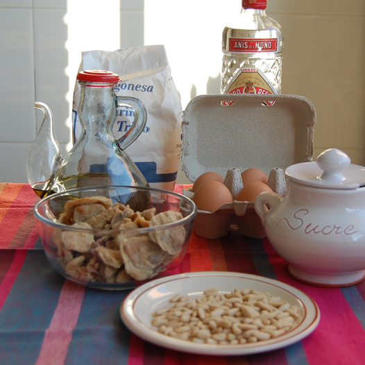 Ingredients for 7 cocas aprox. (1 feeds 1 person): 1/2 kilo of wheat flour, 8 grs of baker's yeast (powder), 3 eggs plus one yolk, 100 grs of sugar, 500 grs of olive oil, 200 grs of pork greaves, 50 grs of anise liquor and a good bunch of pine nuts.