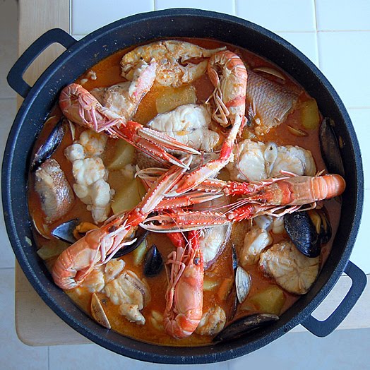 For the dish: 1 red scorpion fish, 1 monkfish, 1 gilt-head (sea) bream or similar, 5 crayfish, a bunch of clams and a bunch of mussels, 500 grs of potatoes, 1 onion, 2 ripe tomatoes, olive oil and salt.