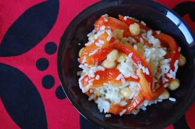 I simply grilled the fresh ones (20 to 30 minutes in the oven’s grill at high temp.). Boiled some rice in salty water and drained. Heated 3 tablespoons of olive oil in a pan and added one guindilla, after aromatizing the oil, added some cooked chickpeas and the drained rice. Stirred a bit and turned the heat off. Presented in a small bowl and added some peeled stripes of grilled red pepper. Seasoned with some extra virgin olive oil and salt.