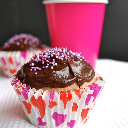 Ingredients for a batch of 12: 2 eggs, 125 grs of butter, 225 grs of brown sugar, 125 ml of milk, 270 grs of cake flour, 2 teaspoons of baking powder, 1 teaspoon of vanilla extract, 75 grs of chocolate chips and 1 tablespoon of cocoa powder.For the toping: 75 grs of black chocolate (70% cocoa), 100 grs of butter, 80 grs of cream, 185 grs of icing sugar, 1 teaspoon of vanilla extract and some sugar coloured tiny candy.