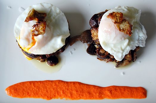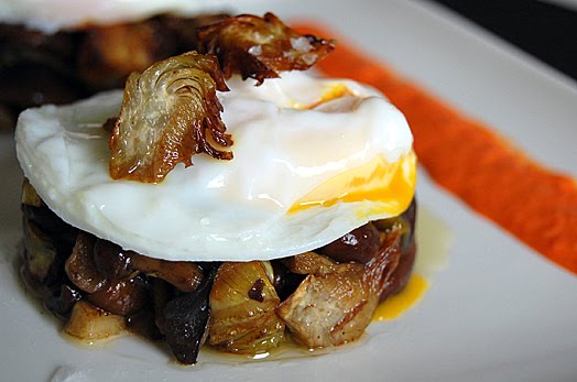 Mushrooms and Artichokes’ Timbal with Poached egg and Piquillos’ Sauce