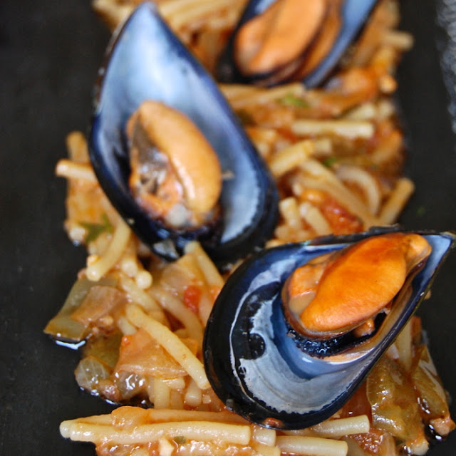 Slow cooking is like tantric sex, there’s no hurry in getting the sofrito done; patience is the key, steaming the mussels with low heat will make them get their best flavor, simple ingredients when preparing the fish stock… forget about pressure cookers, precooked mussels, canned fried tomatoes, frozen seafood… Enjoy every step of the process, take your time to get the best out of every produce, let the ingredients get their own climax… Should I invite Sting for this casserole? ;D He would surely appreciate the method!