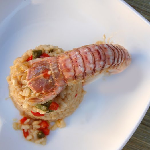 Ingredients for 4 servings: 32 fresh Squilla Mantis, 200 grs of onion, 50 ml of dry Jerez, 400 grs of Bayo Bomba rice, one small green pepper, half red pepper, 20 garlic cloves, half coffee spoon of red sweet ground paprika, some ground black pepper, some salt and extra virgin olive oil.
