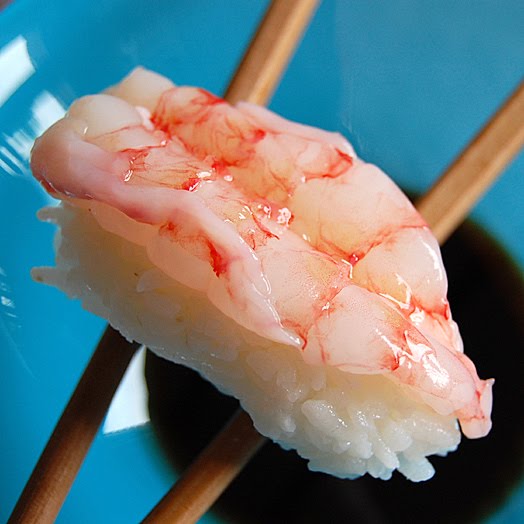 To prepare the Ebinigiri (shrimp over rice): 8 fresh red shrimps. Peel the skin off, make a cut over its back, take its intestin away and let both sides open. Keep fresh until you put them over the cooked handful of rice.