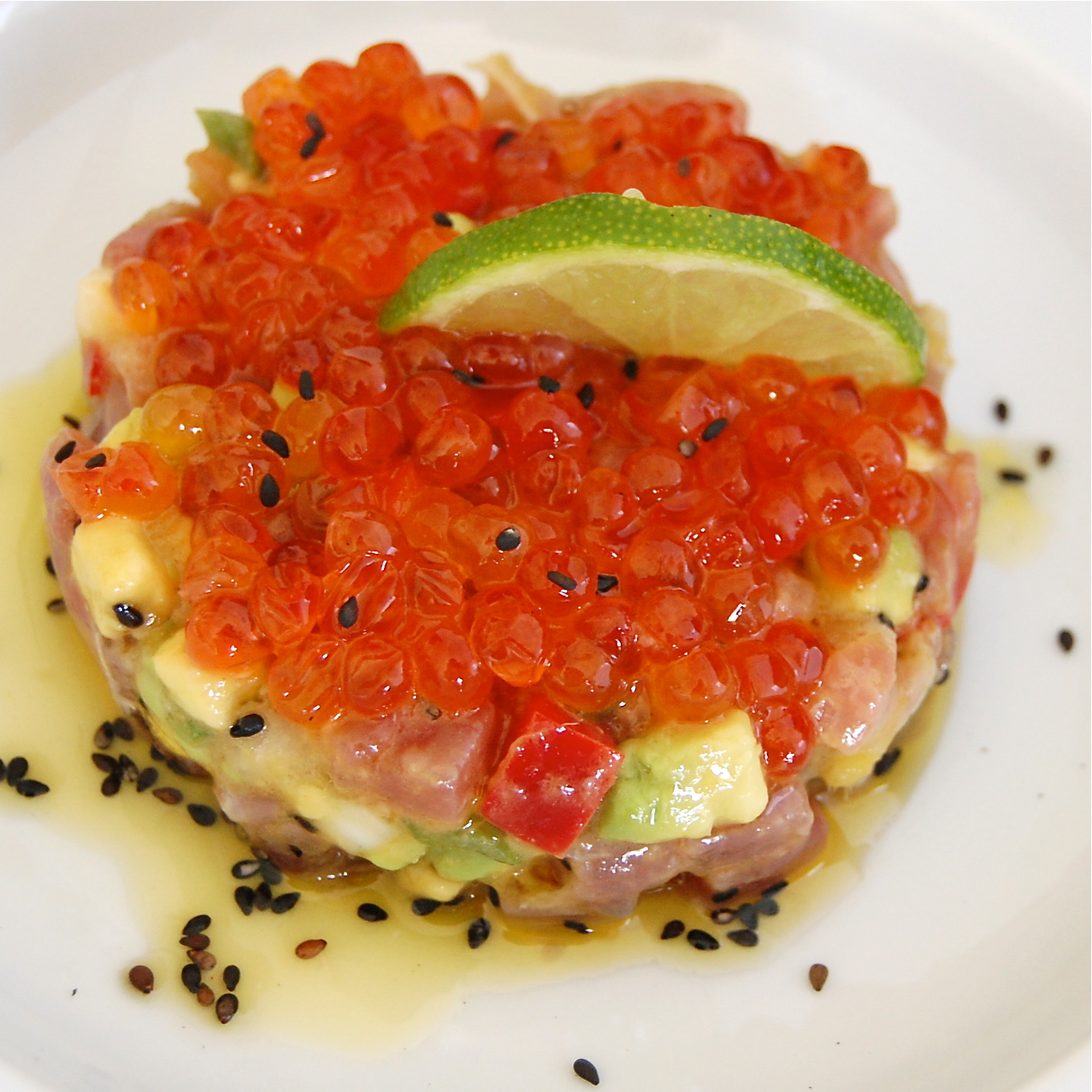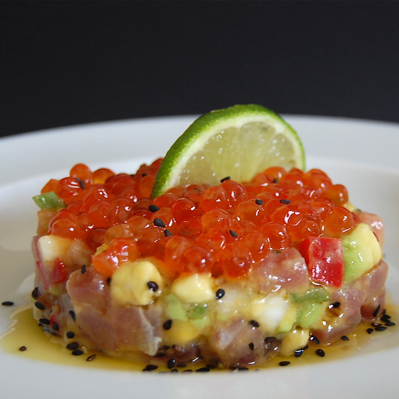 Tuna’s Tartare with fruits vinaigrette and salmon roe crown