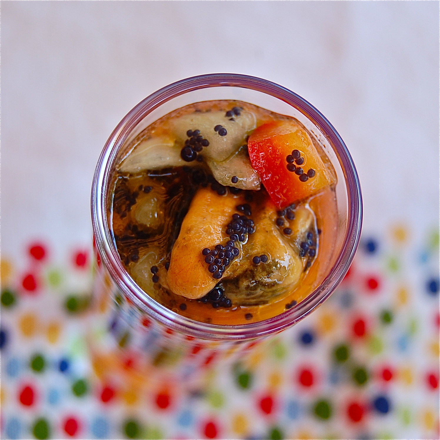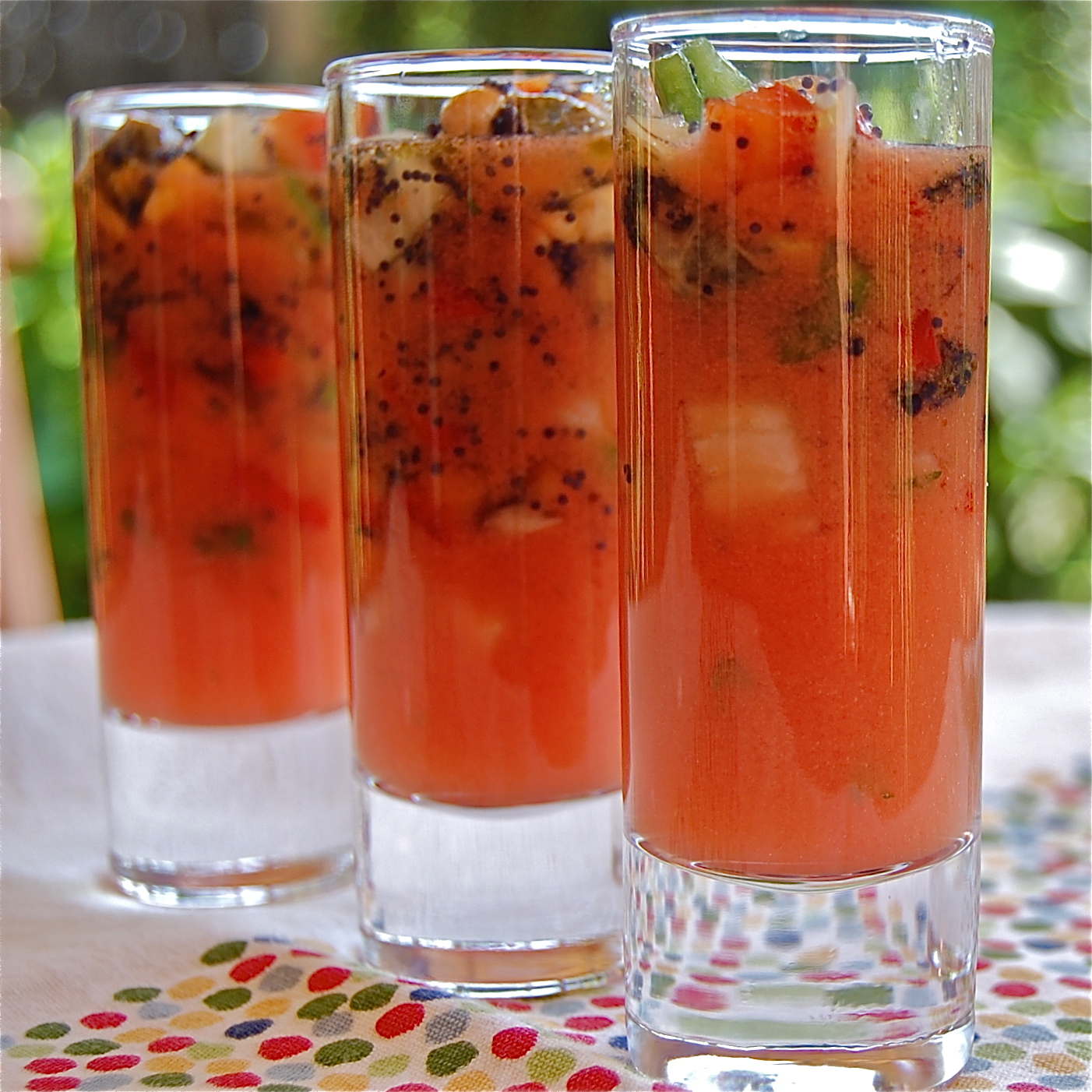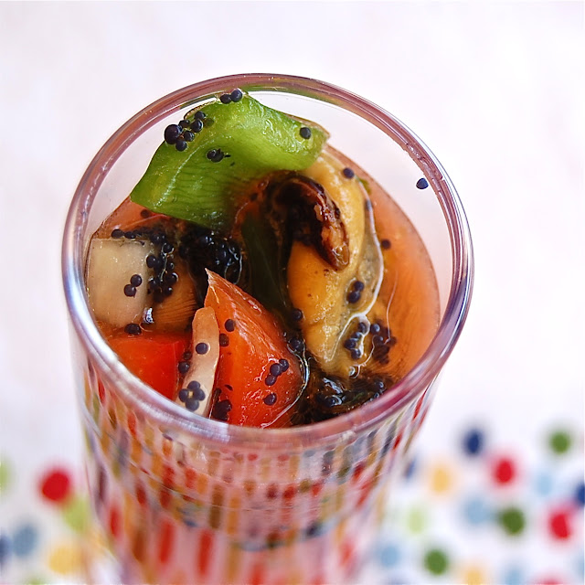 - Prepare the shots with the bowl gazpacho, pour the veggies on top and some mussels and the roe and serve.