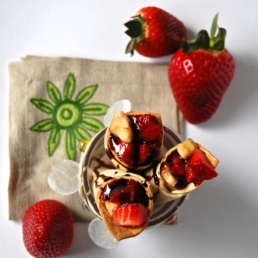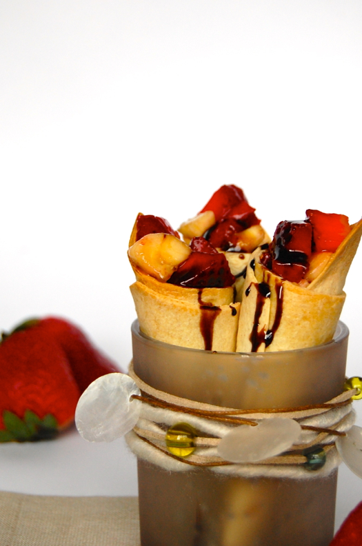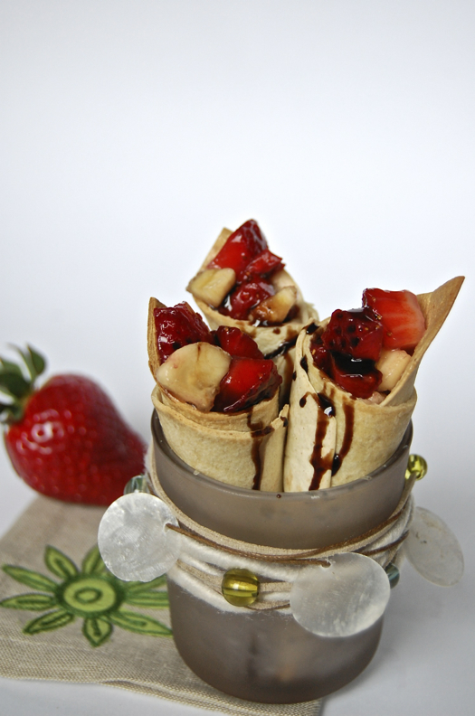 Ingredients for 4 servings: 6 wheat tortillas, 10 big strawberries, 1 or two bananas (depends on size), sugar, modena vinegar.