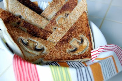 - Get two bread slices and fill them with the mixture. Put two mushrooms slices on one slice and in a different sauce pan over a bit of butter, toast with the mushrooms side facing the pan bottom. Press a bit with a wooden tool, when done turn it upside down and toast the other side.