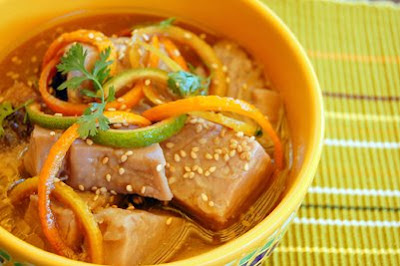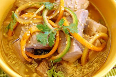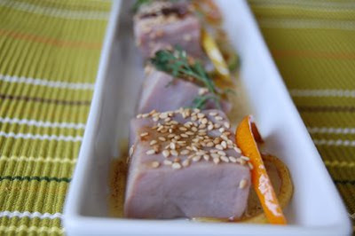 2nd.- Strain the tuna dices and place in a new bowl. Mix half the citrics juice with the vinagrette, stir and pour on top of the tuna. Sprinkle with the sesame seeds and decorate with citrics skin and coriander leaves.
