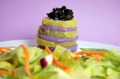 So, the ingredients for this Warm Purple Potato Salad are the following: 3 medium purple potatoes, 4 medium monalisa potatoes, some lettuce, some carrots strings, some black olives, thick sea salt and extra virgin olive oil (feel free to dress it the way you like it better).
