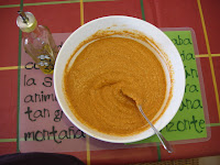 •Ingredients: 5 ripe tomatoes, 2 garlic heads and two garlic cloves, 5 ñoras (dryed red pepper), olive oil, salt, 150 grs. of toasted hazelnuts and 150 grs. of toasted almonds. 2-3 mint leaves (optional).