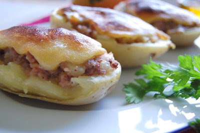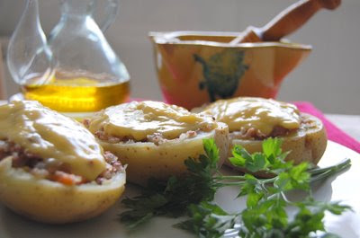 - When cold, cut in half, carefully empty them and place in the sauce pan with the butifarras mixture. Stir until it becomes a paste and use it to stuff the empty potatoes. Taste and add salt if you wish.