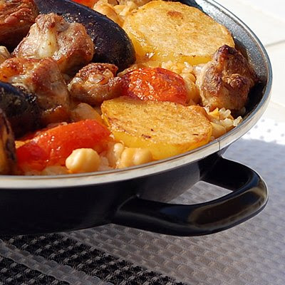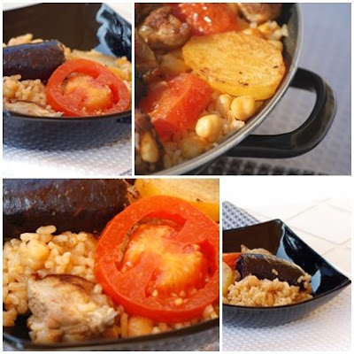 Ingredients for 4 servings: 300 grs of pork rib, 400 grs of boiled chickpeas, 300 grs of rice (arborio, extra or bomba type), 700 grs of stock, 1 big red tomatoe, 1 onion, 1 garlic head, 1 big potatoe, 2 morcillas (onion ones), 4 table spoons of grated tomatoe, 1 teaspoon of sweet red paprika, 6 saffrons strips, olive oil, and salt.